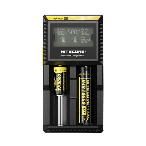 Nitecore D2 Charger: cargador inteligente universal, compatible con casi todas las baterías recargables cilíndricas, eliminando así la necesidad de poseer varios cargadores. El D2 detecta automáticamente Li-ion, las baterías de Ni-MH y Ni-Cd, y por medio de la selección manual también es capaz de cargar baterías LiF e PO4. De circuito de carga inteligente selecciona el modo de carga óptima (CC, CV y dV / dt) para una batería dado y cada uno de dos monitores microordenador controlado ranuras de carga luego de la D2 y carga la batería de forma independiente. Además, una pantalla LCD digital integrado claramente muestra progreso, tensión, corriente y tiempo de carga, mientras que una función de apagado automático inteligente termina corriente cuando la carga está completa.
